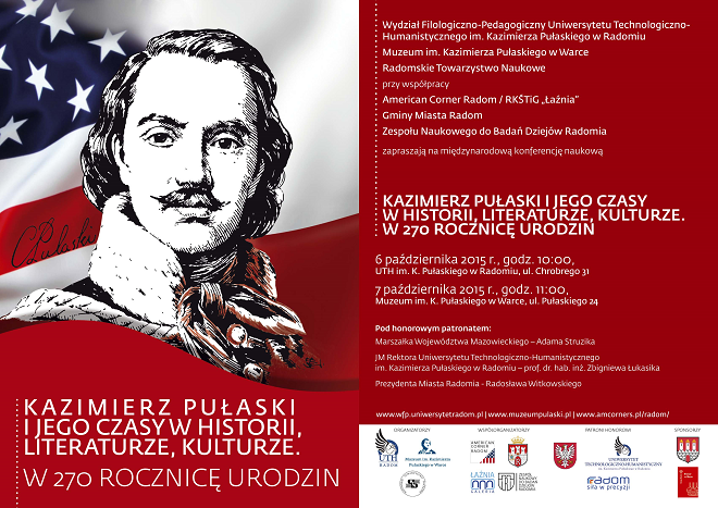 W dniach 6-7 października 2015 roku w Radomiu i Warce odbędzie się międzynarodowa konferencja naukowa „Kazimierz Pułaski i jego czasy w historii, literaturze, kulturze. W 270 rocznicę urodzin”. Organizatorami wydarzenia są: Uniwersytet Technologiczno-Humanistyczny im. Kazimierza Pułaskiego w Radomiu (Wydział Filologiczno-Pedagogiczny, Katedra Filologii Polskiej), Muzeum im. Kazimierza Pułaskiego w Warce, Radomskie Towarzystwo Naukowe. Konferencja została przygotowana we współpracy z Zespołem Naukowym do Badań Dziejów Radomia / Gminą Miasta Radomia oraz American Corner Radom / Radomskim Klubem Środowisk Twórczych i Galerią „Łaźnia”. Program konferencji obejmuje referaty specjalistów z różnych dziedzin nauki: historii, literaturoznawstwa, historii idei, kulturoznawstwa, historii sztuki. Prelegenci przedstawią wyniki badań dotyczących rodziny Kazimierza Pułaskiego, jego działalności militarnej w Polsce i USA oraz interpretacji jego życia w literaturze, malarstwie, rzeźbie, muzyce i filmie. Spotkanie będzie doskonałą okazją do świeżego, wieloaspektowego spojrzenia na postać Pułaskiego – bohatera dwóch narodów. Referaty przedstawione na konferencji zostaną wydrukowane w recenzowanej publikacji naukowej.