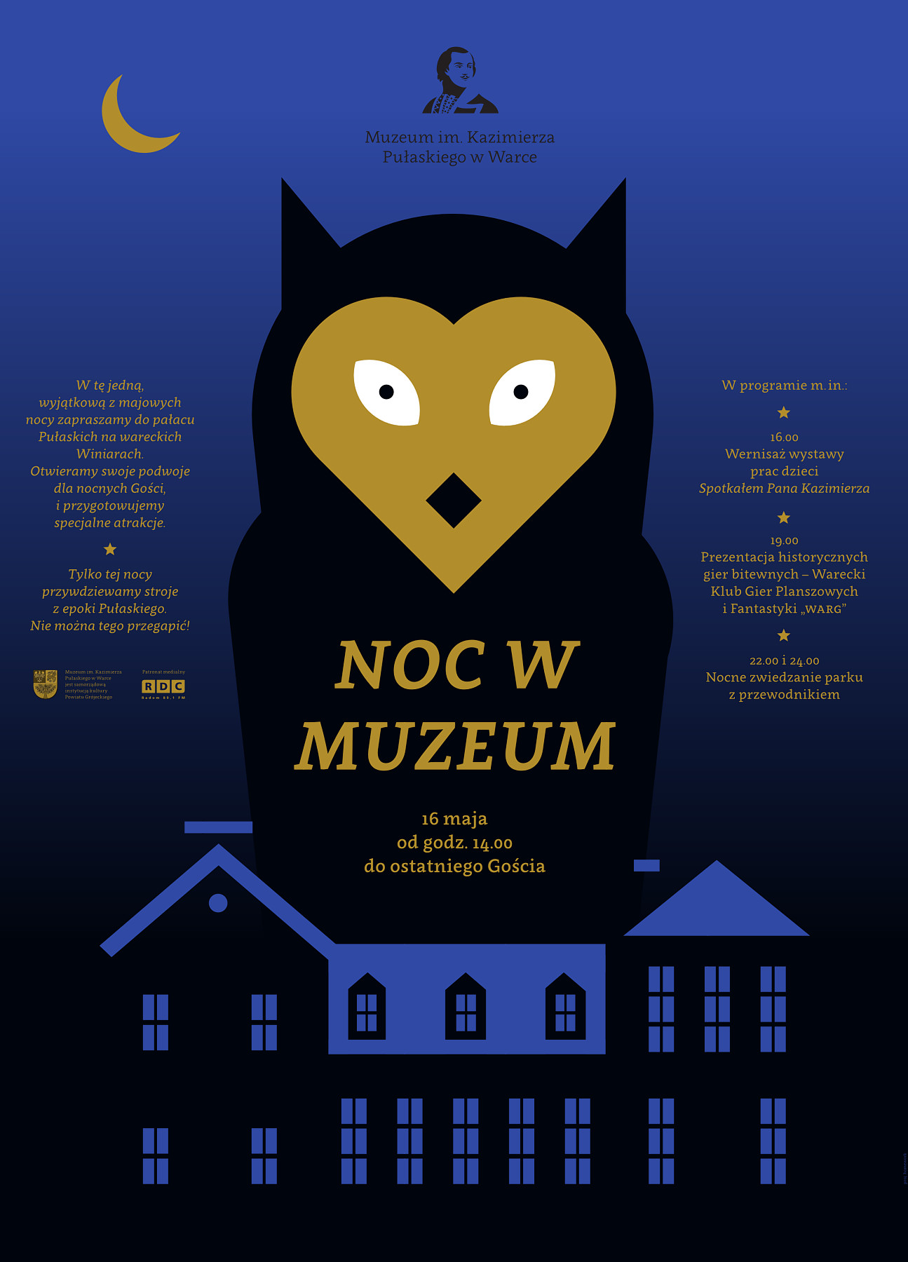 Cieszyliśmy się Waszą obecnością już od wczesnych godzin popołudniowych. Do parku przyszło znacznie więcej spacerowiczów niż zwykle. Oprócz zwiedzania pałacowych wnętrz, nasi Goście mogli podziwiać wystawę prac dzieci, które wzięły udział w konkursie plastycznym pt. „Spotkałem Pana Kazimierza”. Pasjonaci intelektualnej rozrywki zostali zaproszeni przez Warecki Klub Gier Planszowych i Fantastyki „WARG” – na rozegranie partii historycznych gier planszowych. W pałacu rozbrzmiewała muzyka fortepianowa w wykonaniu Mateusza Miziołka z Warki, a także naszego Gościa z Radomia – pana Andrzeja Wartyniego. Miłośnicy poezji śpiewanej mogli posłuchać koncertu pt. „IN BLANCO” w wykonaniu Dariusza Rączki i zespołu FANTASMAGORIA. W kawiarence na tarasie, można było skosztować domowych ciast i napić się kawy serwowanej przez Zajazd na Winiarach.