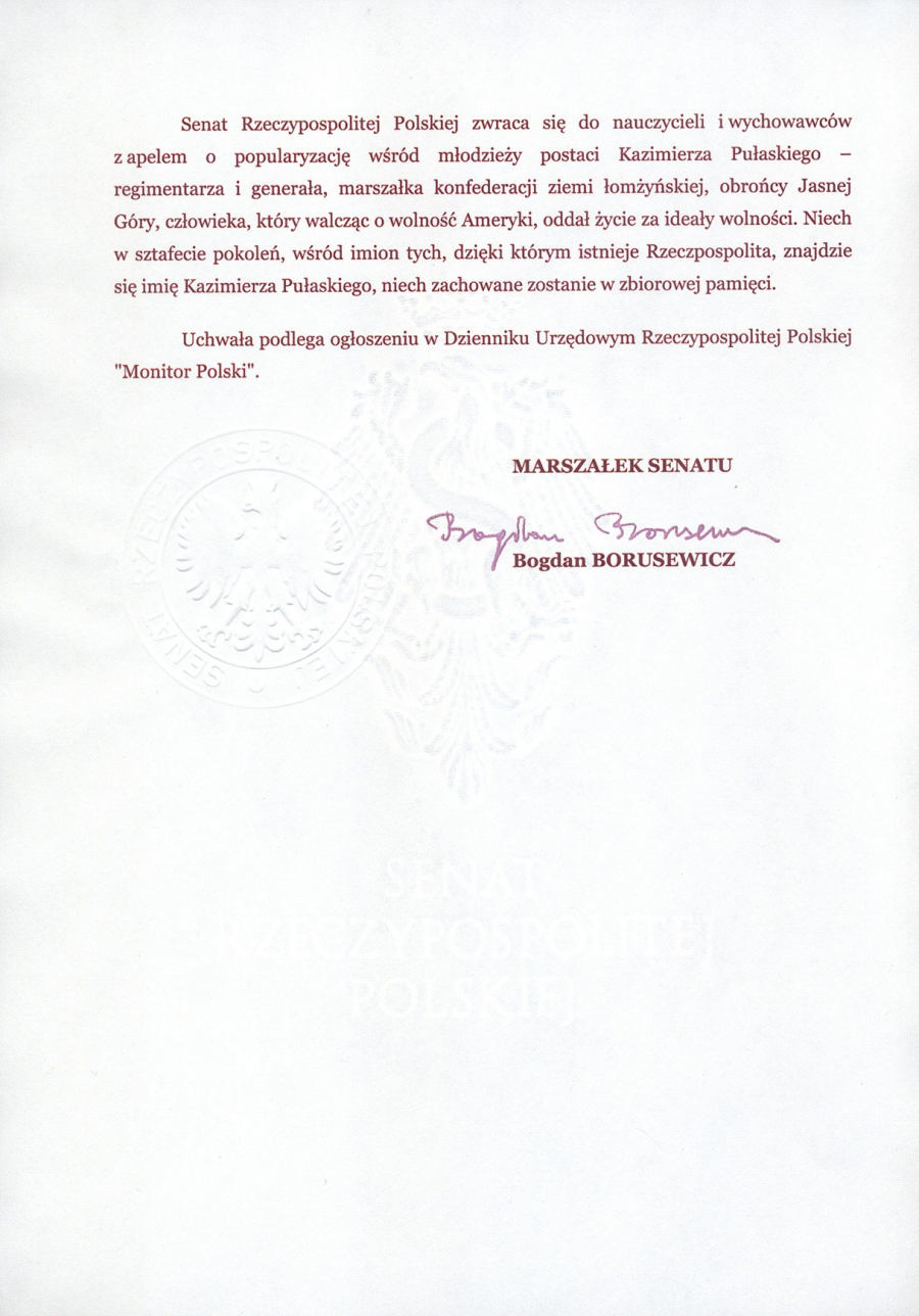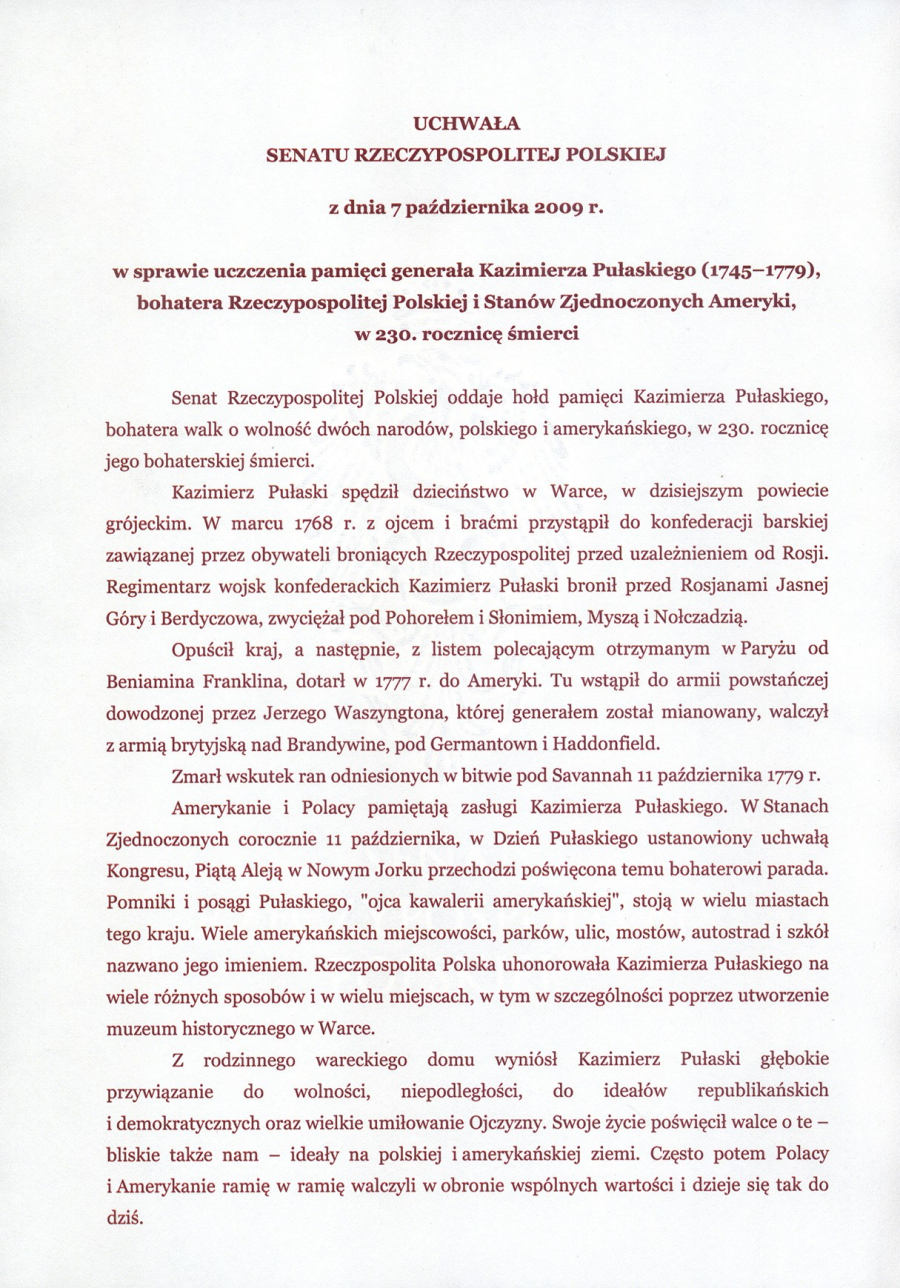 W dniu 7 października 2009 Senat Rzeczypospolitej Polskiej podjął jednogłośnie Uchwałę w sprawie uczczenia pamięci generała Kazimierza Pułaskiego (1745-1779), bohatera Rzeczypospolitej Polskiej i Stanów Zjednoczonych Ameryki, w 230. rocznicę śmierci.
